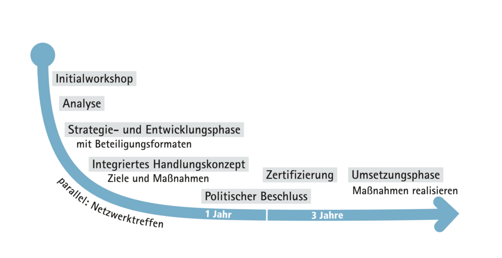 Die Entwicklung des Strategiekonzepts ist jedoch nur ein Zwischenschritt. Der Beschluss zur Umsetzung der enthaltenen Maßnahmen durch kommunale Gremien ist eine Voraussetzung für eine Begutachtung und Erteilung des Zertifikats „Familiengerechte Kommune“.